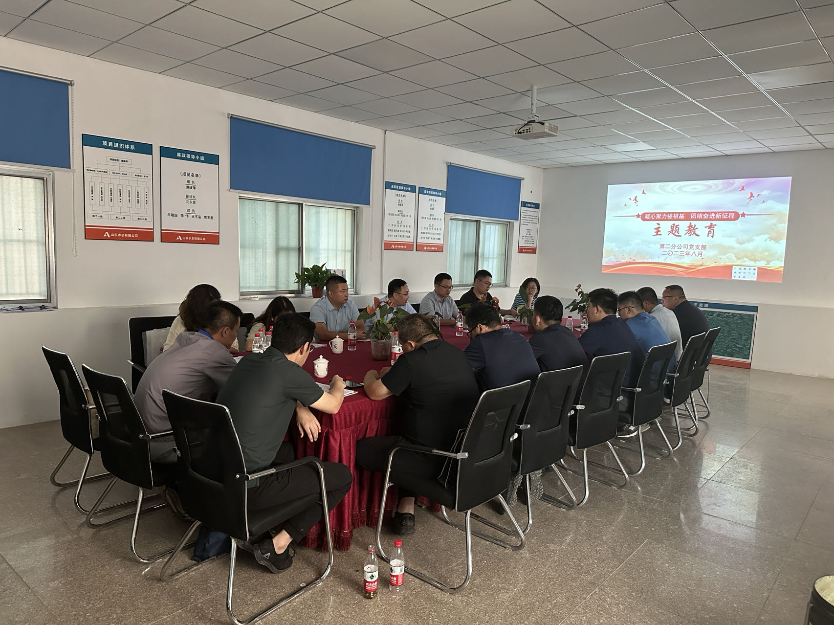 为贯彻落实公司党委关于“凝心铸魂强根基 团结奋进新征程”主题教育读书班(第一专题)的通知要求,8月13日,第二分公司党支部在平阴安防项目部组织开展主题教育读书班,第二分公司二级主管及以上人员参加学习。